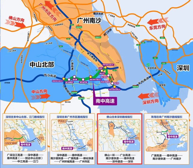飞架珠江口,一桥通三市。南中高速联通广州、中山、深圳三市,全长32.4公里,由主线及南沙联络线(万顷沙支线)组成,是国家高速公路网G2518、省高速公路网S78及跨珠江通道体系的重要组成部分。