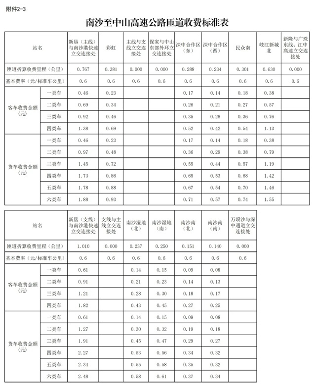 根据此前批复的收费标准,收费车型执行《收费公路车辆通行费车型分类》,收费费率为0.6元/标准车公里,1至4类客车的收费系数分别为1、1.5、2、3,1至6类货车的收费系数分别为1、2.1、3.16、3.75、3.86、4.09,专项作业车的收费标准参照货车执行。