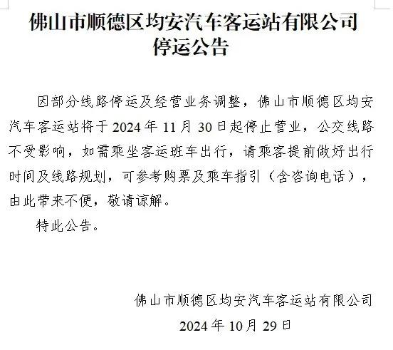 顺德均安汽车客运站11月30日起停运!最新乘车指引!