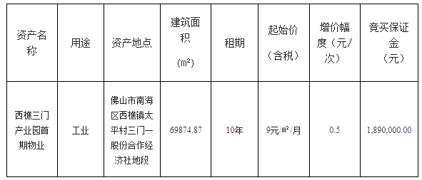 备注:项目物业(厂房/宿舍)共69874.87㎡,其中四层厂房4栋、十层宿舍1栋;租期10年,其中装修免租期6个月;合同履约保证金为成交价的3个月租金。