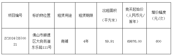 广东托信项目管理有限公司(以下简称:交易代理机构)受佛山市顺德区飞鹅永久墓园管理处(以下简称:出租方)委托采用网上竞价方式,对大良东乐路111号商铺出租项目(二次)进行网上公开竞价,欢迎合格的竞价人参与竞价。