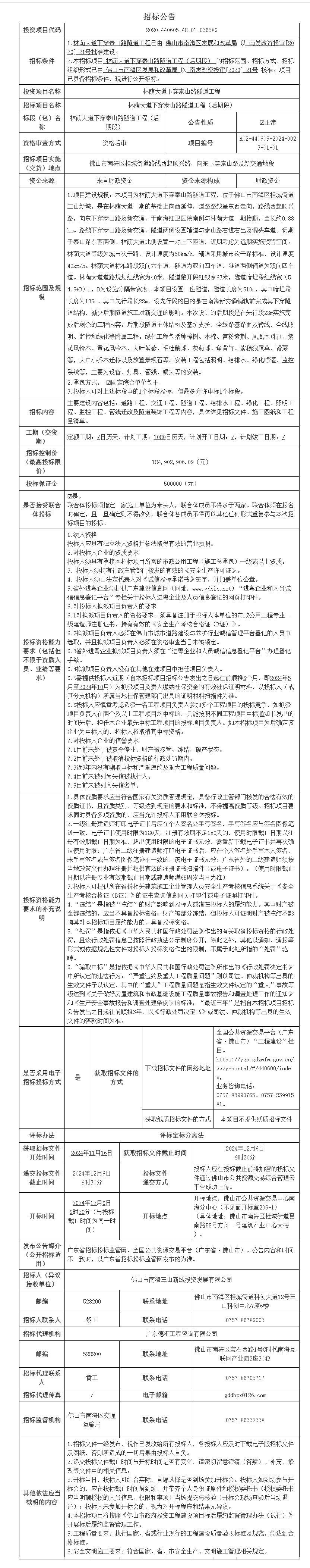 南海区桂城街道林荫大道下穿泰山路隧道工程(后期段)招标公告