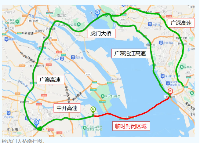 深圳往中山方向:广深沿江高速或广深高速—南沙大桥—广澳高速—中开高速。