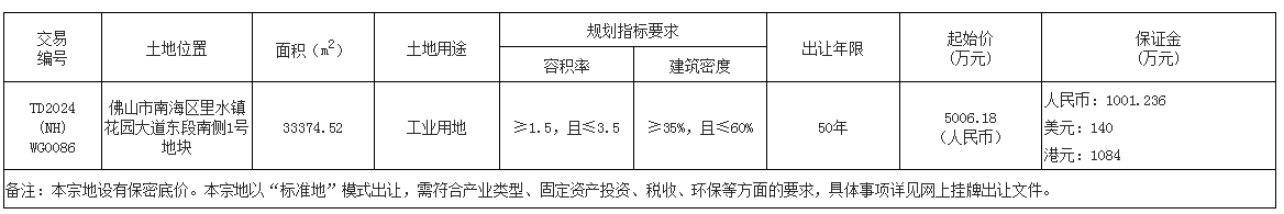 八、自本次公告起至网上挂牌截止期间,如有关于本宗地竞买文件的修改、澄清、说明等将通过网上交易系统以及佛山市南海区人民政府网发布,请有意参与竞买者密切留意。其它未尽事宜,详见本宗地的网上挂牌出让文件。