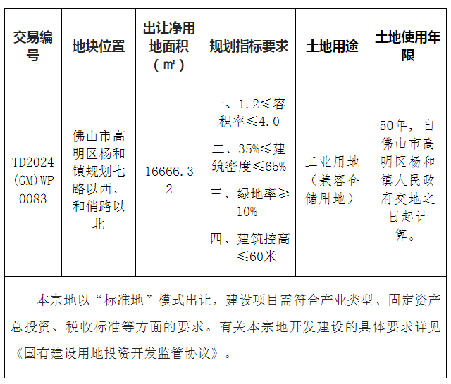 本块地其他规划建设要求按《高明区土地使用规划条件》(佛规明设函〔2024〕0167号)执行。