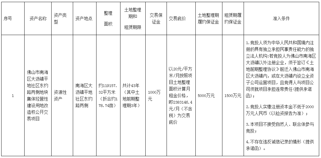 (十九)竞投公告未详细明确的相关事宜,以本交易方案后附的《佛山市南海区大沥镇黄岐社区“平天台”专业市场地块集体经营性建设用地改造权公开交易项目交易方案》及其全部附件内容为准,请务必认真通读整份交易方案。