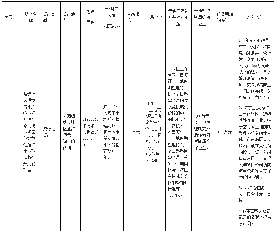 南海盐步社区迴龙青年大岭地块及迴兴路北侧地块集体经营性建设用地改造权公开交易项目竞投公告