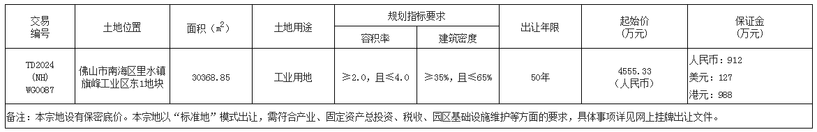 八、自本次公告起至网上挂牌截止期间,如有关于本宗地竞买文件的修改、澄清、说明等将通过网上交易系统以及佛山市南海区人民政府网发布,请有意参与竞买者密切留意。其它未尽事宜,详见本宗地的网上挂牌出让文件。