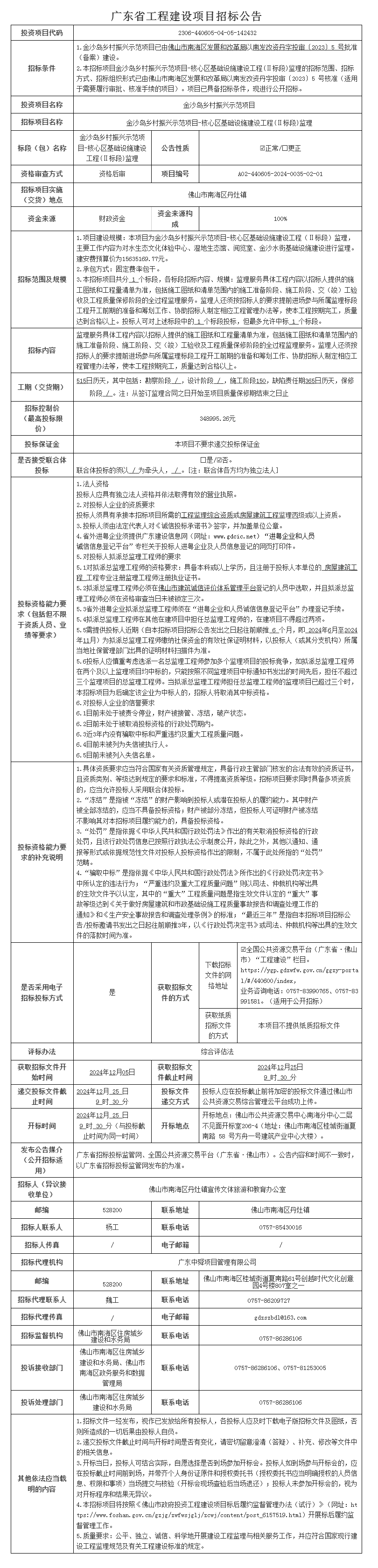 南海丹灶金沙岛乡村振兴示范项目-核心区基础设施建设工程(Ⅱ标段)监理招标公告