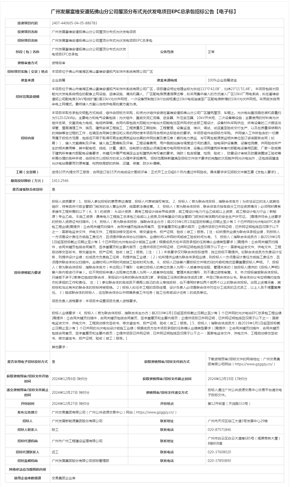广州发展富维安道拓佛山分公司屋顶分布式光伏发电项目EPC总承包招标公告