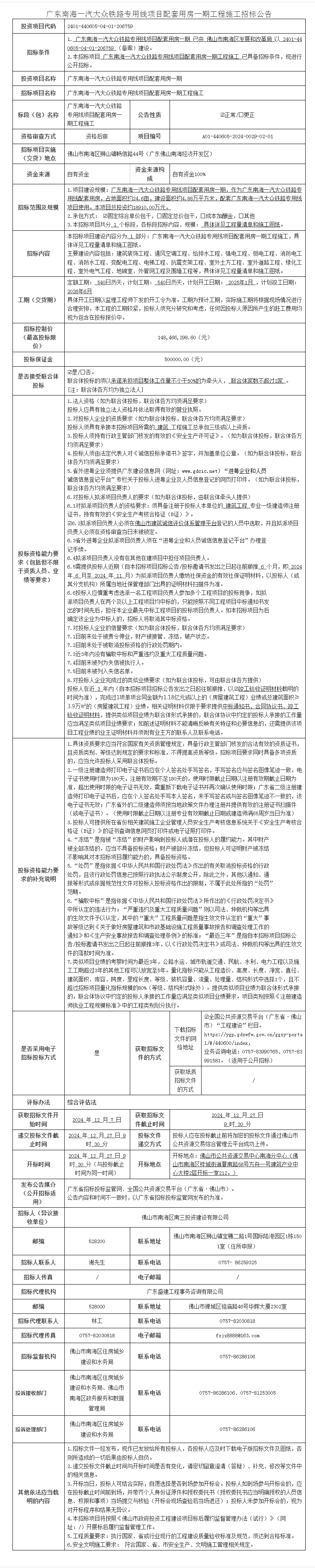 广东南海一汽大众铁路专用线项目配套用房一期工程施工招标公告