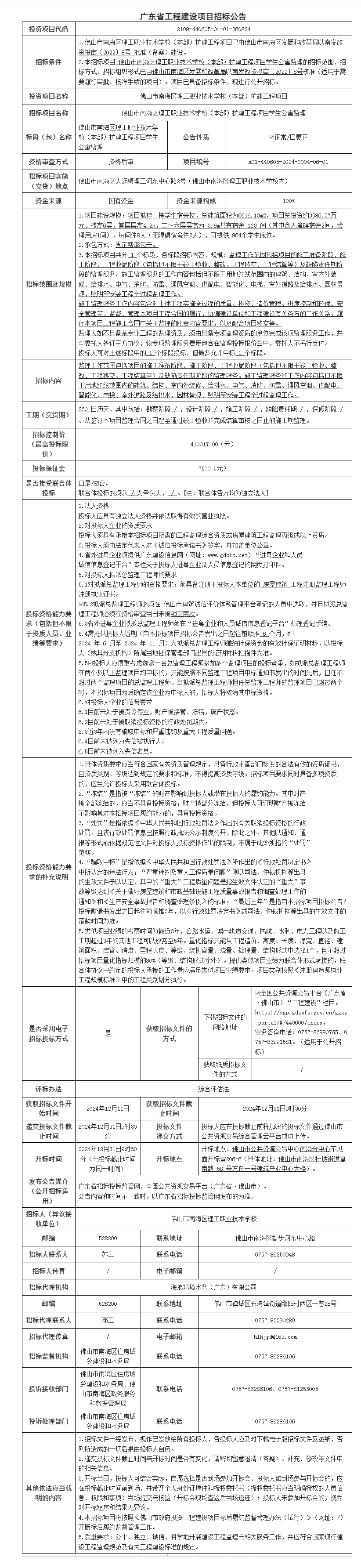 佛山市南海区理工职业技术学校(本部)扩建工程项目学生公寓监理招标公告