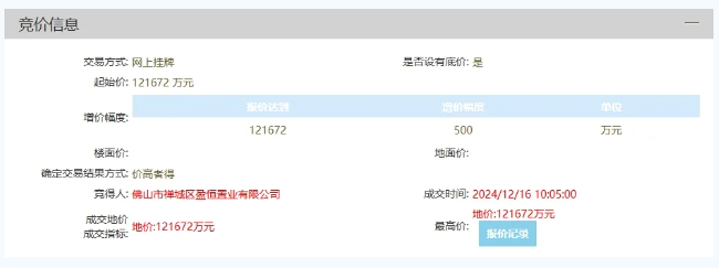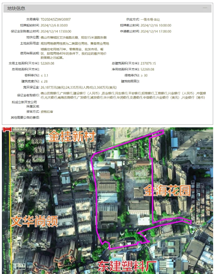 12月16日,位于祖庙街道文沙南路北侧、规划15米道路东侧的鲤鱼沙储备地块由佛山市禅城区盈恒置业有限公司以121672万元的价格拍卖成交。据了解,佛山市禅城区盈恒置业有限公司是保利华南全资子公司。