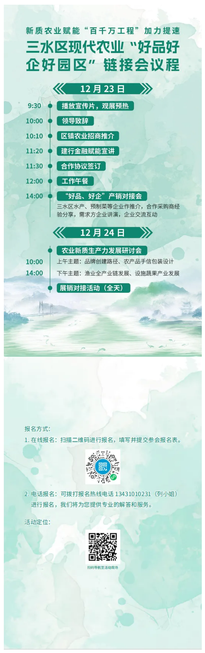 为深入实施“百千万工程”,积极践行创新驱动发展战略,促进农业产业升级与融合发展,广东三水首届现代农业“好品好企好园区”链接会将于12月23日至24日在广东省广州市白云区云城东路碧桂园云立方C栋二楼举行。