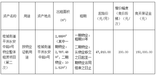 4.本标的物分两期交付给竞得人使用,其中一期物业租金底价39,788.40元/月,二期物业租金底价8,121.60元/月,增价幅度200元/次(一期物业及二期物业各增加100.00元/次)。