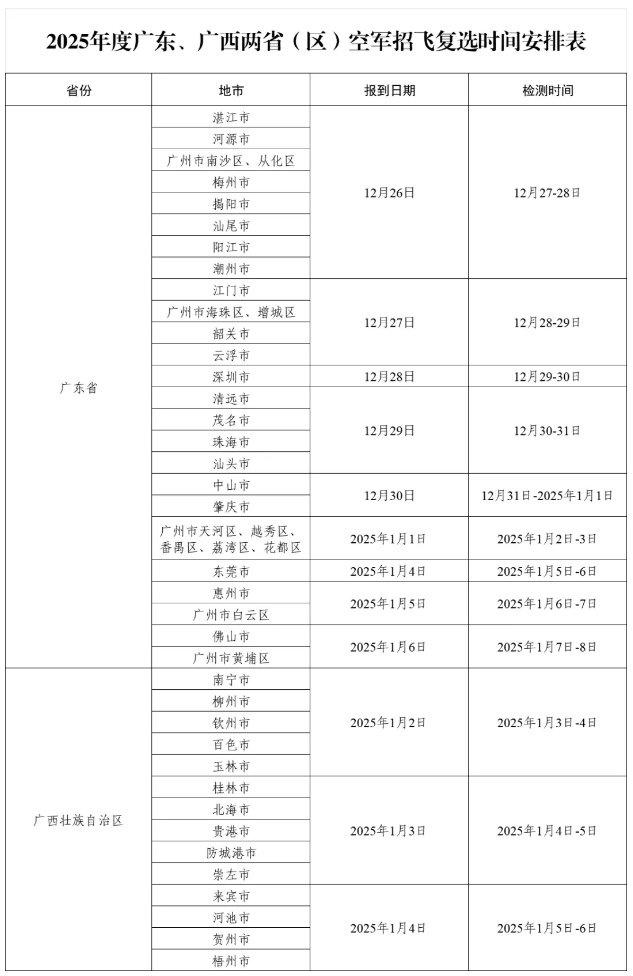 根据空军招飞年度工作安排,将于12月26日至2025年1月8日,在广州选拔中心(广州)设站,组织粤、桂两省(区)空军招收高中生飞行学员复选检测工作。其中佛山市考生检测时间为2025年1月7-8日,有关安排一起来看!