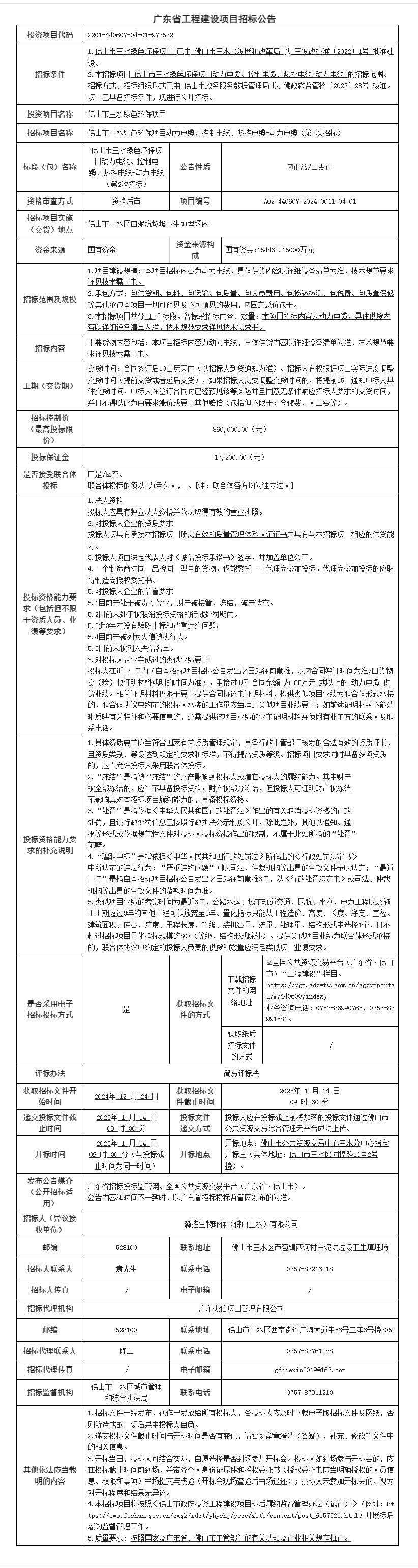 概述:本招标项目 佛山市三水绿色环保项目动力电缆、控制电缆、热控电缆-动力电缆 的招标范围、招标方式、招标组织形式已由 佛山市政务服务数据管理局......