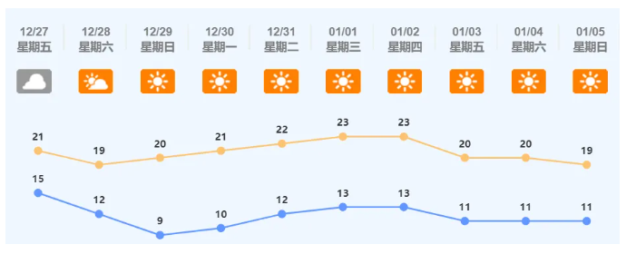 预计今明两日受新一股中等偏弱冷空气影响,我市多云转晴,北风加大至3到4级,阵风6级,日平均气温下降3到5℃,过程最低气温9℃左右,出现在29日早晨。