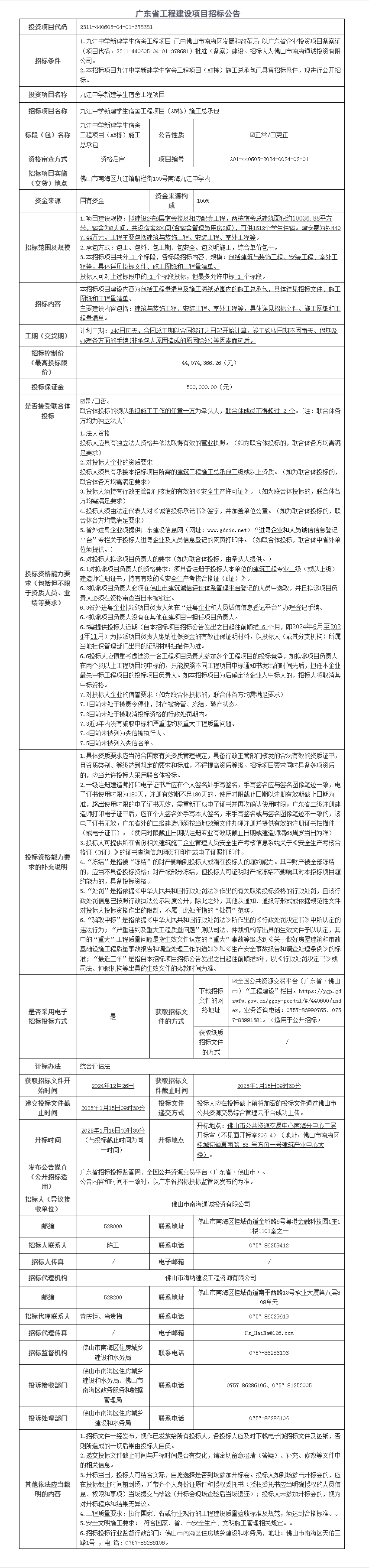 南海九江中学新建学生宿舍工程项目(AB栋)施工总承包招标公告