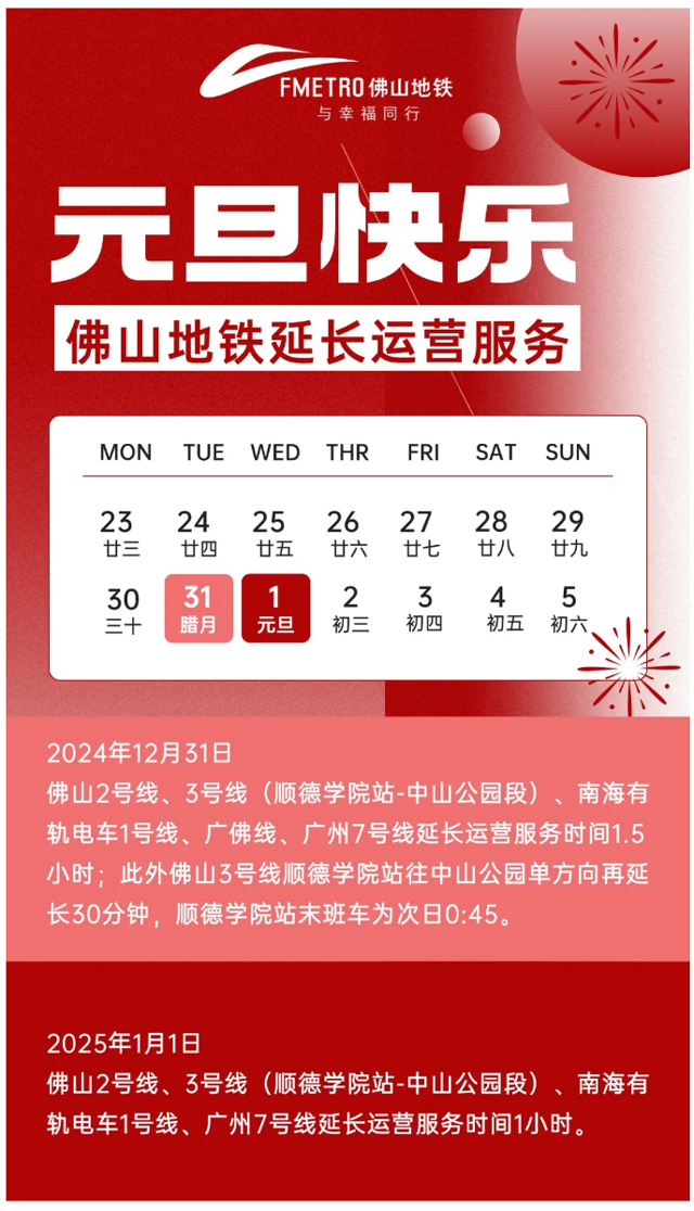 2025年元旦假期即将来临,为满足广大市民的出行需求,佛山地铁将对运营服务时间进行调整: