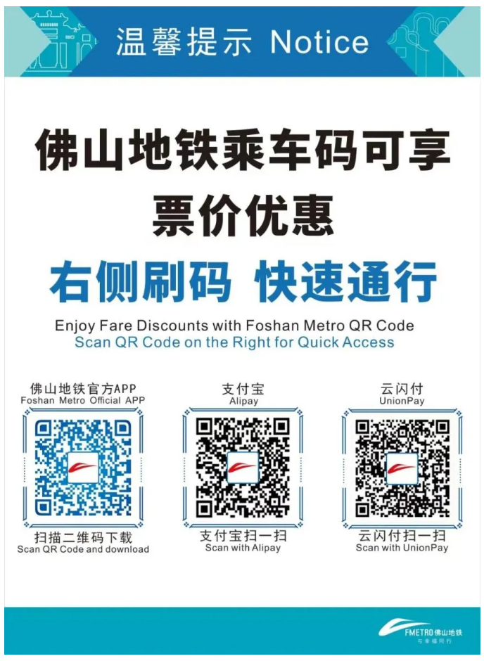 提前下载佛山地铁App并完成注册,过闸机时提前打开乘车码,通行快速又便捷,而且还能享受票价累额优惠哦!