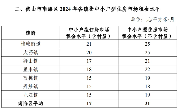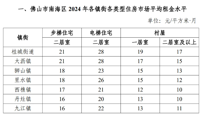 根据南海区各镇街各类型住房市场平均租金水平,桂城和大沥的租金水平较高,二居室住宅平均租金水平根据步梯房和电梯房的不同,平均月租金分别为21元/㎡·月和28元/㎡·月。