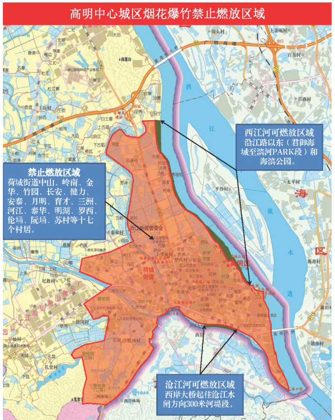 三水荷花世界、三江水韵公园(部分区域)、云东海荷香湖公园(以荷香湖为中心,东起南丰大道,南至湖岸绿化带,西至湖岸,北至府前路)、云东海彩虹桥(以荷香湖主题公园中心岛为中心,东起映海路,南至湖岸,西至云海路,北至湖岸)、西南左岸及右岸公园(沿西南涌两岸步道设置,左岸公园起点自健身广场对出涌边位置,终点至距广三高速150米处;右岸公园起点自靠区应急管理局旁公厕对出涌边位置,终点至距广三高速340米处),以及禁燃区域内的各自然村。