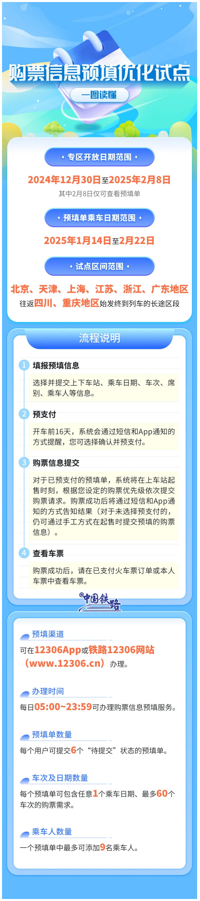 即日起,铁路12306用户可通过新开设的“购票信息预填优化试点”专区,预填乘车日期为春运期间(2025年1月14日至2月22日)任意一天的购票订单,每个订单可选择“1个乘车日期+最多60个车次”的组合,每名用户最多可同时保有6个待提交的购票订单,每个订单的乘车人最多不超过9人。