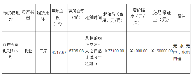 3、租金收取方式:租金采用先交付后使用的方式,签订合同之日起五日内支付首期租金,之后竞得人必须于每月十五号前缴付当月租金给出租人,支付方式为银行代扣/银行转账,拖欠租金不得用履约保证金抵扣。