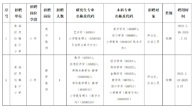 本场招聘短期临聘教师(代退休、产假)2名。详见《南海区丹灶镇教育系统2024—2025学年面向社会公开招聘短期临聘教师计划和岗位表》。