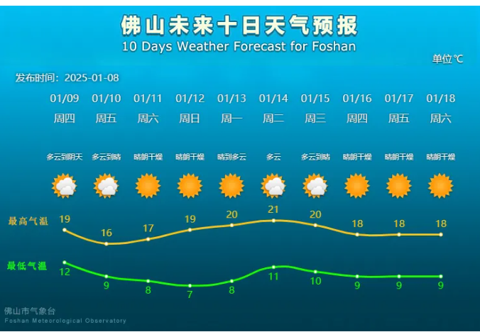 佛山市气象局1月8日预报,9日傍晚至11日冷空气持续南下影响佛山,北风加大至3到4级,阵风6到7级,平均气温下降3℃~5℃,12日早晨将出现过程最低气温7℃左右(山区5℃以下,局部有霜冻)。我市气象部门于9日较大可能发布寒冷黄色预警信号,不排除升级寒冷橙色预警信号的可能性。
