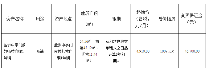 3.产权证照情况:有土地证照(竞买人应充分考虑其风险,一经存入竞买保证金即表示承认、接受本项目的现状,愿意按约定支付租赁价款和遵守租赁合同的约定)。
