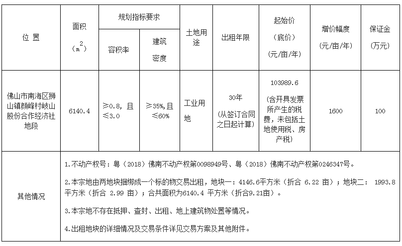 八、自本次公告起至网上挂牌截止期间,如有关于本地块网上挂牌出租文件的修改、澄清、说明等将通过上述网上交易系统、佛山市南海区人民政府网发布,不再另行通知,请有意参与竞租者密切留意。其它未尽事宜,详见本地块的网上挂牌出租文件。