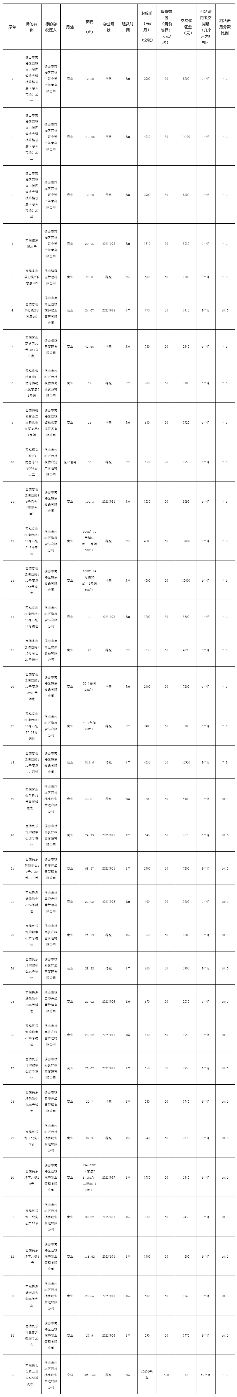 备注:序号1-3物业:上述3宗物业现状为连通,承租人承租物业后须各自向管理人缴交3000元改造保证金,并按管理人要求在两宗物业的分隔处用轻质砖砌筑18厘米厚的墙体至混凝土天花板且两面批水泥沙浆;若相邻2宗物业同期中标,则由2个承租人协商砌筑墙体事项各半承担施工费用。因序号2物业没有出入口,若序号2-3物业同期只有序号3物业中标,则由序号3物业承租人拆除序号2物业正面部分墙体并加装2米*1米铁门,费用由序号3物业承租人负责。上述3宗物业均给予2个月的免租装修期,承租人须提供装修方案经管理人审批后,在租赁期起1个月内完成施工,经管理人验收合格后才办理改造保证金退还手续。物业内存放的货架,如承租人有意向需求,经管理人同意后可使用。