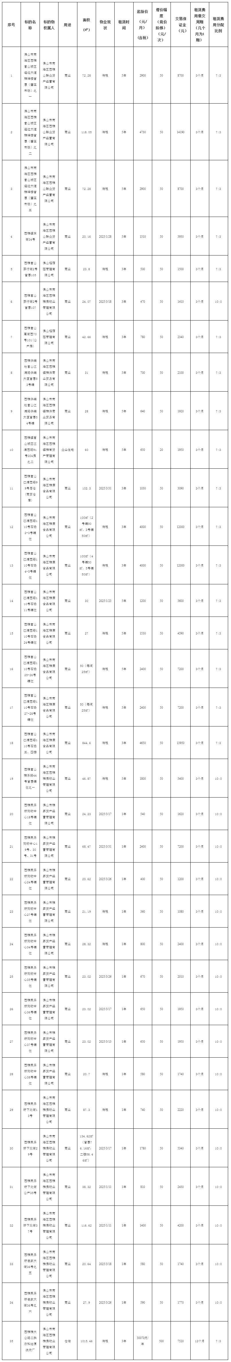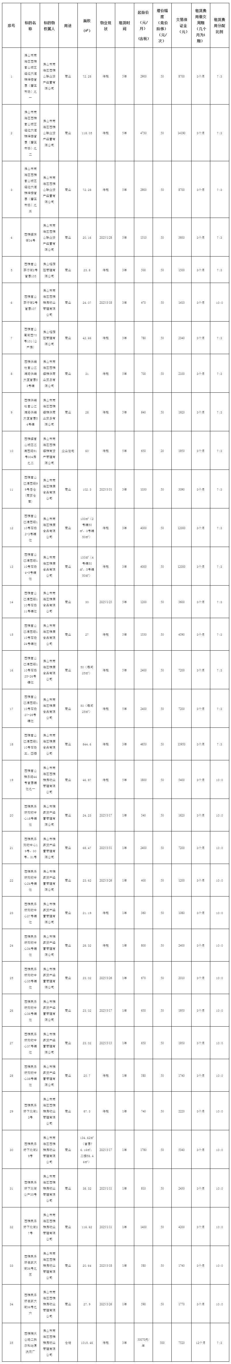 备注:序号1-3物业:上述3宗物业现状为连通,承租人承租物业后须各自向管理人缴交3000元改造保证金,并按管理人要求在两宗物业的分隔处用轻质砖砌筑18厘米厚的墙体至混凝土天花板且两面批水泥沙浆;若相邻2宗物业同期中标,则由2个承租人协商砌筑墙体事项各半承担施工费用。因序号2物业没有出入口,若序号2-3物业同期只有序号3物业中标,则由序号3物业承租人拆除序号2物业正面部分墙体并加装2米*1米铁门,费用由序号3物业承租人负责。上述3宗物业均给予2个月的免租装修期,承租人须提供装修方案经管理人审批后,在租赁期起1个月内完成施工,经管理人验收合格后才办理改造保证金退还手续。物业内存放的货架,如承租人有意向需求,经管理人同意后可使用。