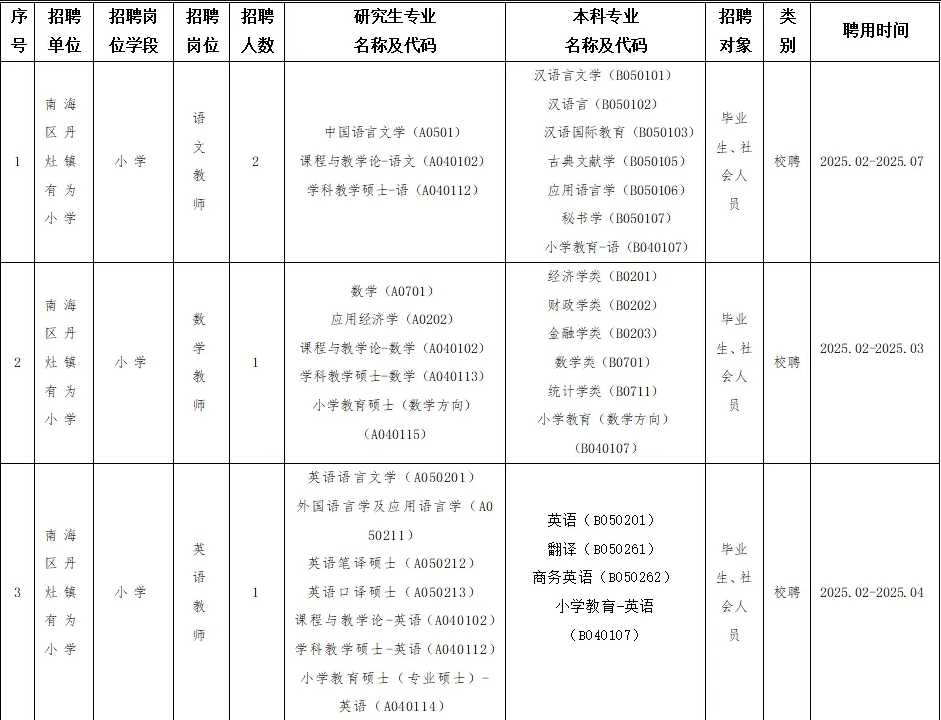 因工作需要,佛山市南海区丹灶镇教育系统2024-2025学年面向社会公开招聘临时聘用专任教师(有为小学专场),现将有关招聘事宜公告如下。
