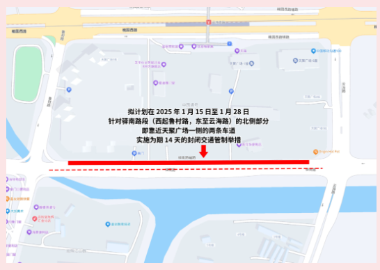 🚗交通管制:针对驿南路段(西起鲁村路,东至云海路)的北侧部分,即靠近天聚广场一侧的两条车道,实施为期14天(2025年1月15日至1月28日)的封闭交通管制举措。管制期间,机动车辆将被禁止驶入该区域,非机动车辆与行人则可正常通行。