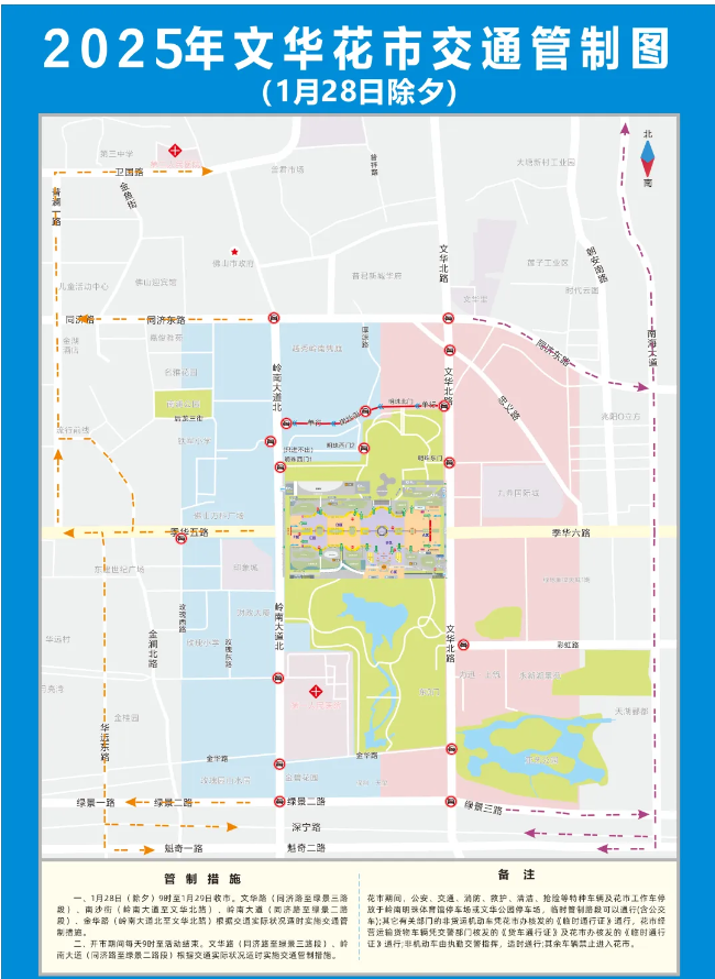 1月1日至1月27日,开市期间每天9时至活动结束,文华路(同济路至绿景三路段)、岭南大道(同济路至绿景二路段)根据交通实际状况适时实施临时交通管制,管制期间禁止机动车通行。