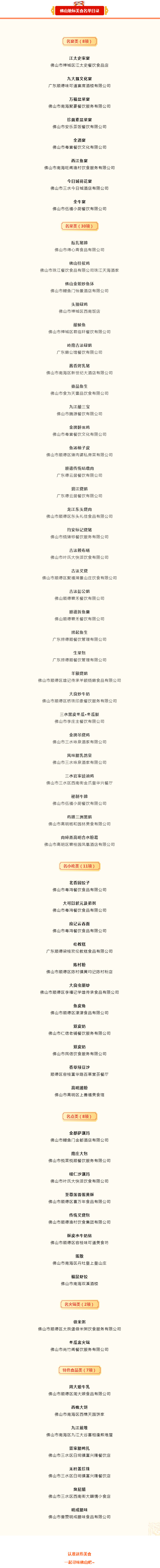 66道佛山地标美食细分为“名宴、名菜、名小吃、名点、名火锅、特色食品”六大类别,在方便市民群众寻味佛山的同时,进一步推动地方特色菜品和餐饮文化拓展升级,持续擦亮“岭南味 佛山品”的金字招牌。