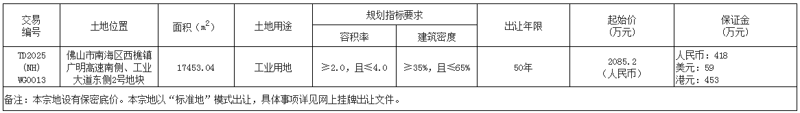 八、自本次公告起至网上挂牌截止期间,如有关于本宗地竞买文件的修改、澄清、说明等将通过网上交易系统以及佛山市南海区人民政府网发布,请有意参与竞买者密切留意。其它未尽事宜,详见本宗地的网上挂牌出让文件。
