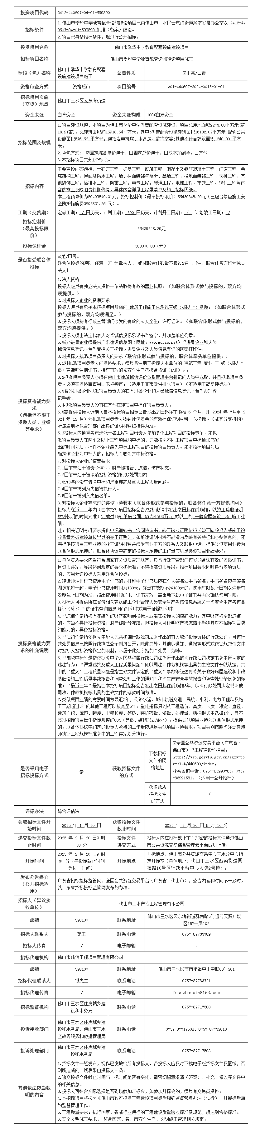 佛山市季华中学教育配套设施建设项目施工招标公告