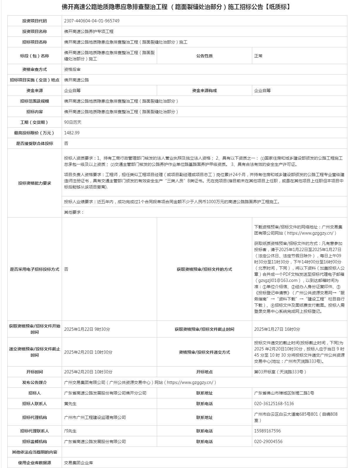 佛开高速公路地质隐患应急排查整治工程(路面裂缝处治部分)施工招标公告