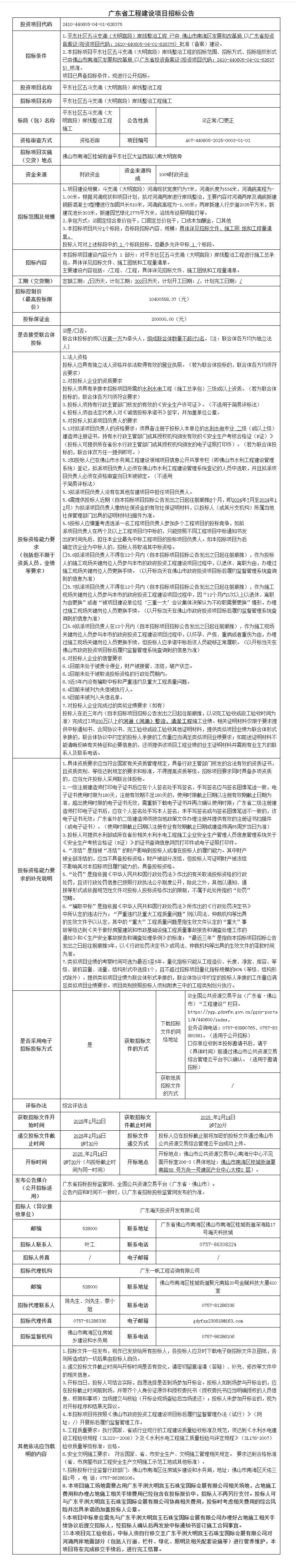 南海桂城平东社区五斗支涌(大明宫段)岸线整治工程施工招标公告