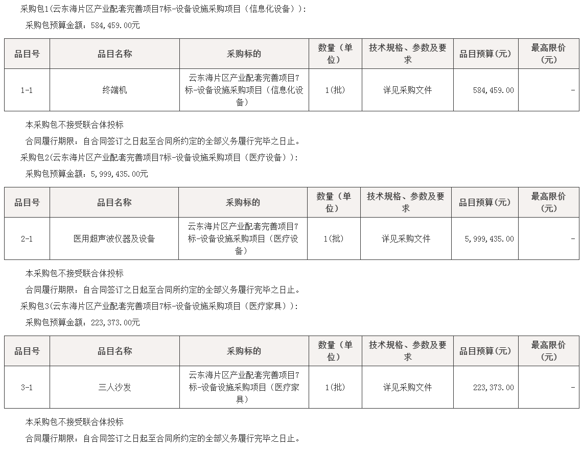 项目名称:云东海片区产业配套完善项目7标-设备设施采购项目
