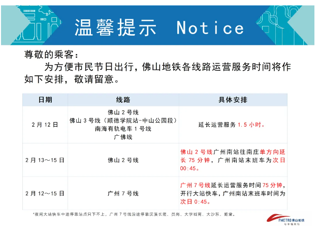 佛山2号线、3号线(顺德学院站-中山公园段),南海有轨电车1号线,广佛线延长运营服务1.5小时。