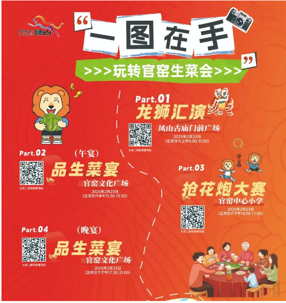 打卡狮山官窑生菜会,除了能品尝超丰盛的生菜宴之外,届时还将有持续一整天的生财庙会同步开锣!祈福市集、潮玩打卡、互动小游戏……各式摊位只等你来!