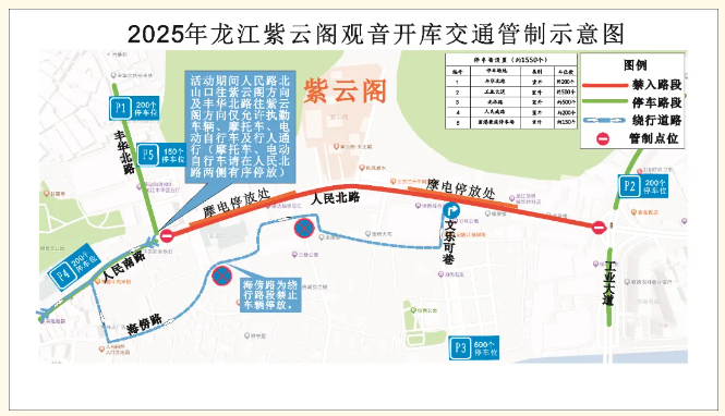 2. 人民路北山口往紫云阁方向及丰华北路往紫云阁方向仅允许执勤车辆、摩托车、电动自行车及行人通行(摩托车、电动自行车请在人民北路两侧有序停放)。