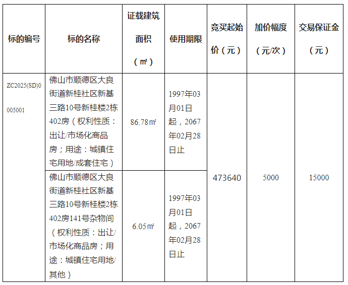 佛山市顺德区不动产登记中心采用网上竞价方式转让位于佛山市顺德区大良街道新桂社区新基三路10号的新桂楼2栋402房及配套141号杂物间,欢迎符合资格的竞买人参与竞价。