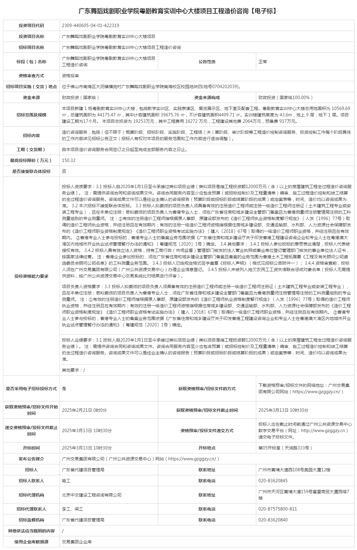 广东舞蹈戏剧职业学院粤剧教育实训中心大楼项目工程造价咨询