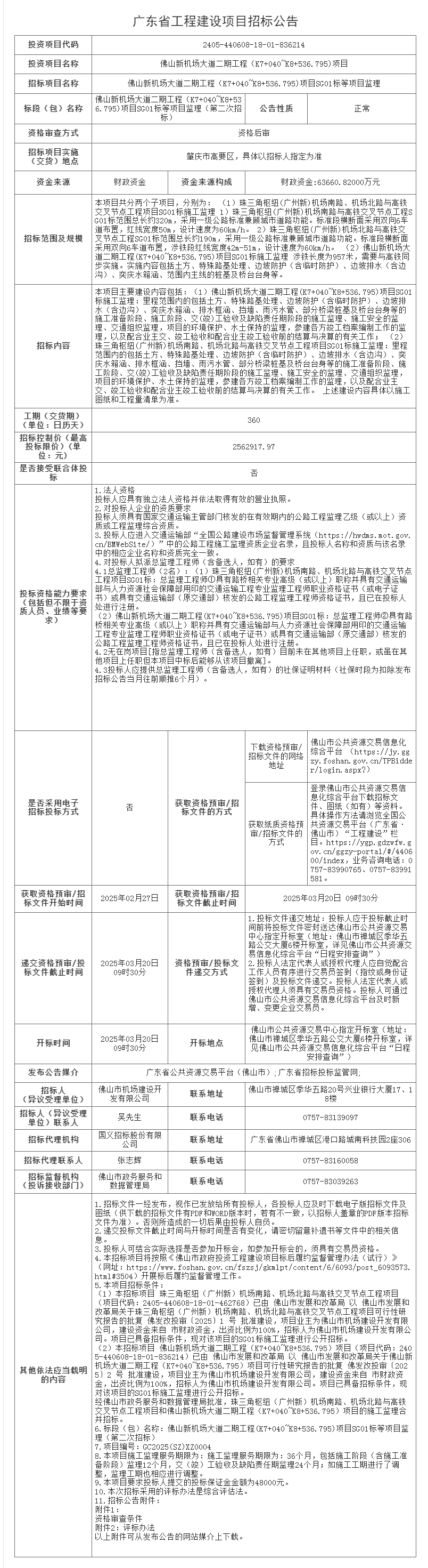 佛山新机场大道二期工程(K7+040~K8+536.795)项目SG01标等项目监理招标公告